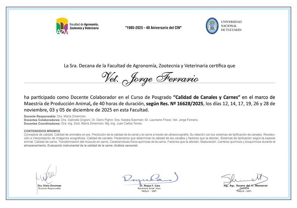 Docente Colaborador en Curso de Posgrado "Calidad de Canales y Carnes"